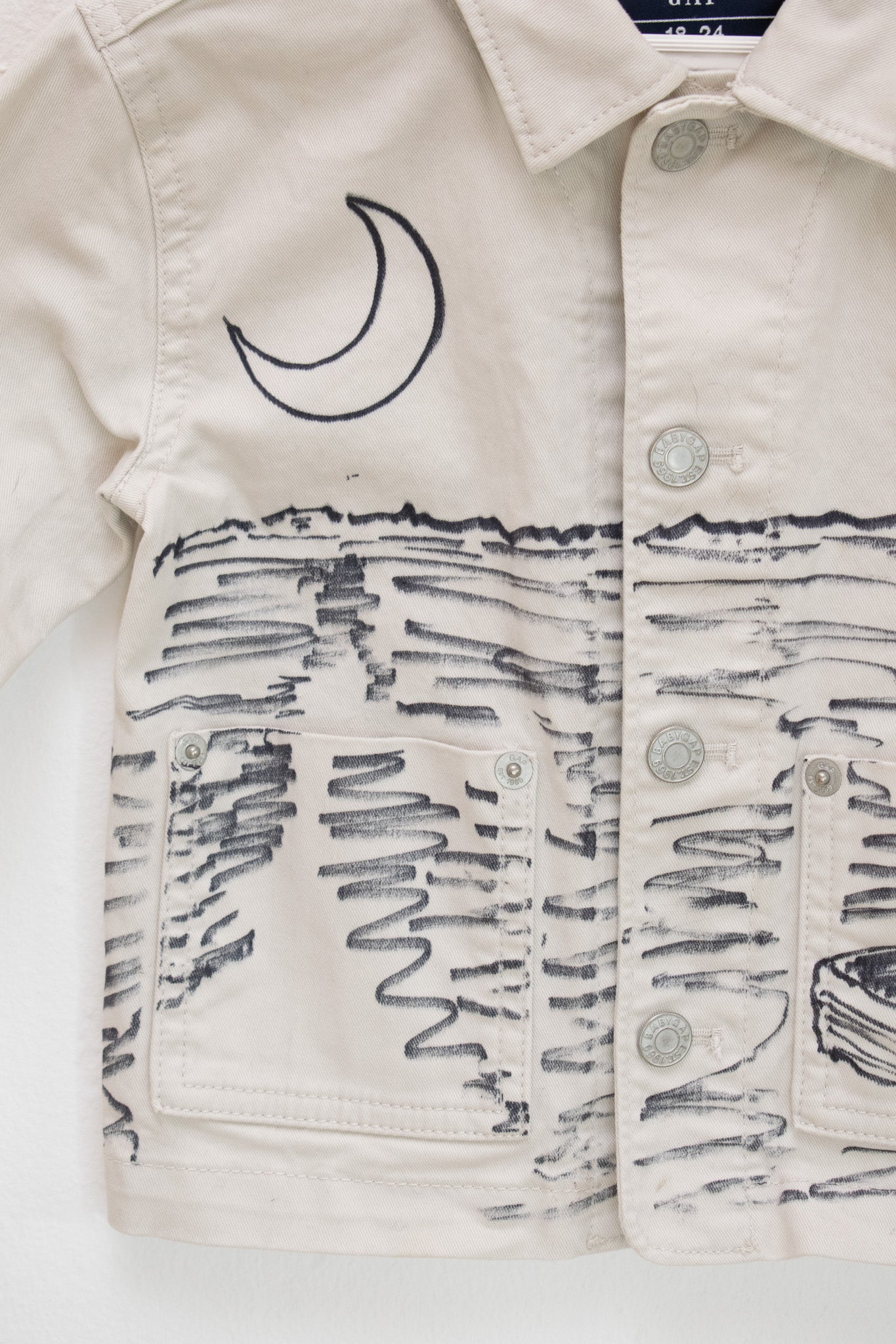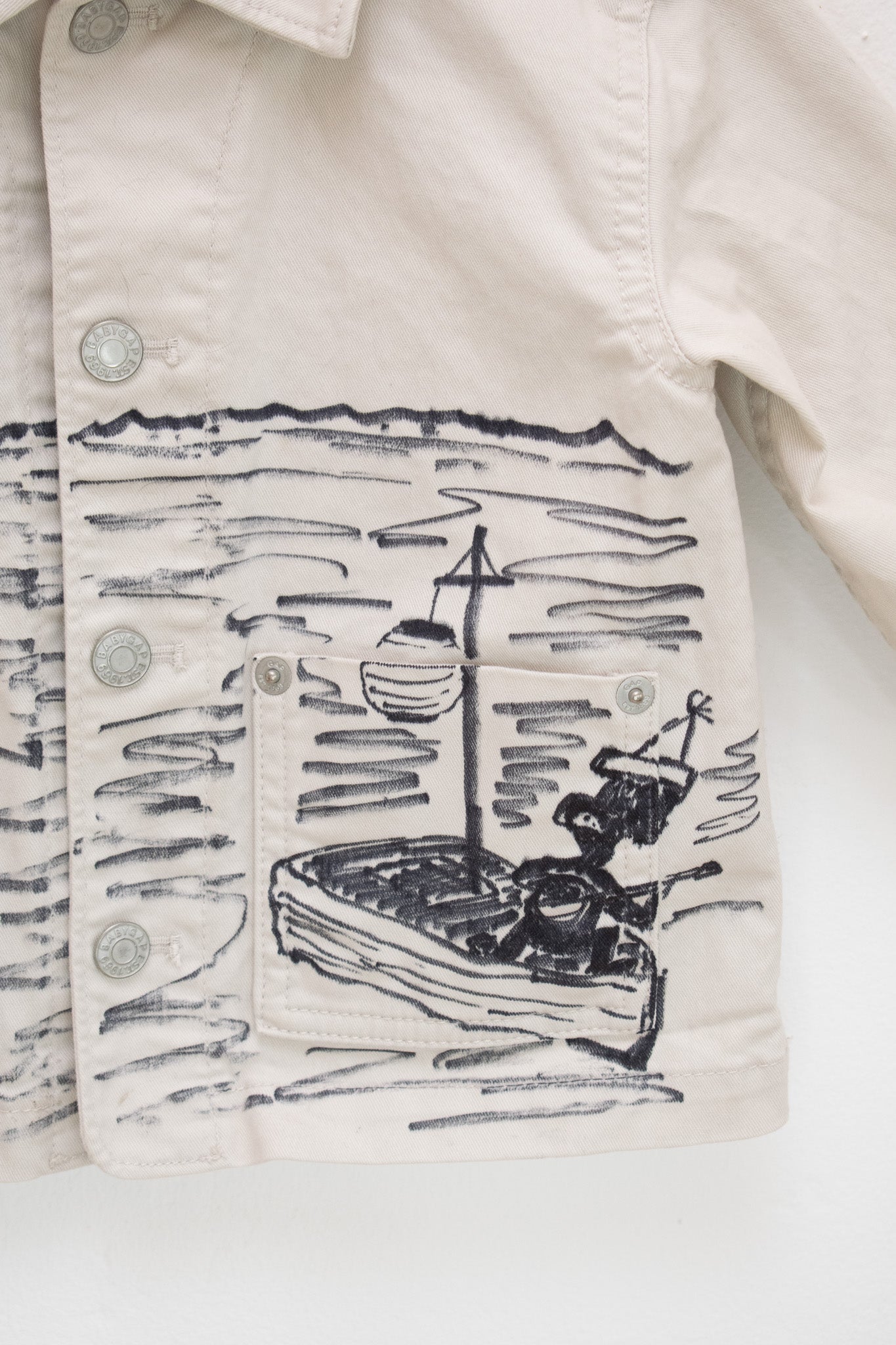 Details: Cotton canvas/twill; button front; classic collar; hip length; hand-drawn permanent-ink artwork on back